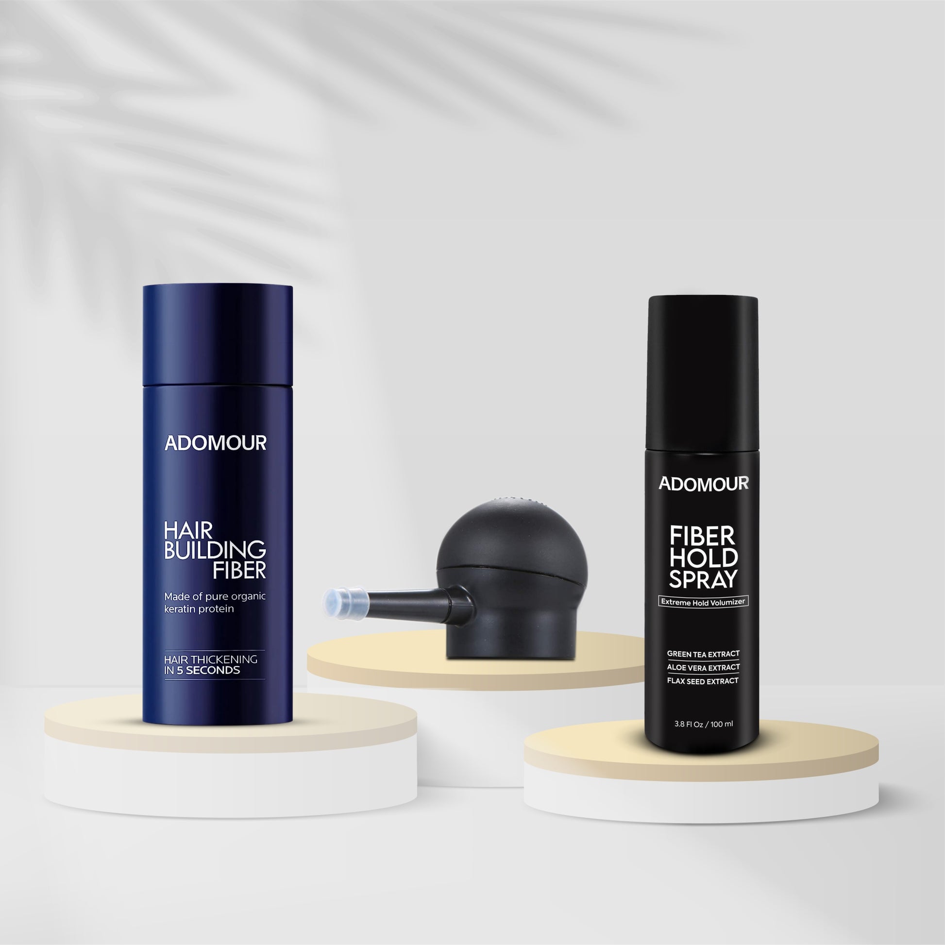 Hair Fiber: Adomour Hair Fibers are lightweight, natural fibers made of Keratin protein, the same protein found in hair strands, that can be applied to your hair giving it a thicker and fuller appearance, hiding thinning spots instantly and effectively. The fibers are given a positive static electric charge, while natural human hair is naturally negatively charged. The Fibers latch to the natural hair due to the opposing charges, covering the thinning spots and giving a fuller appearance.