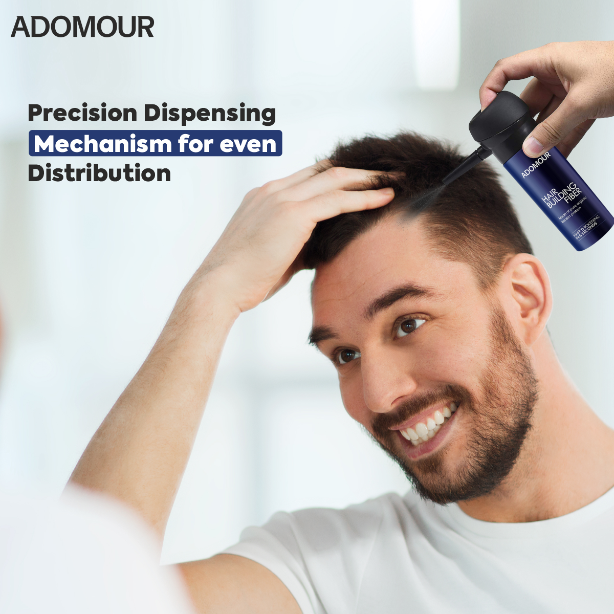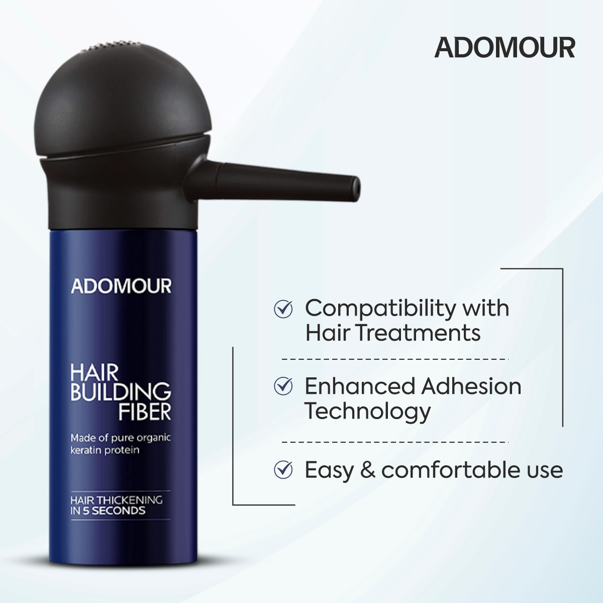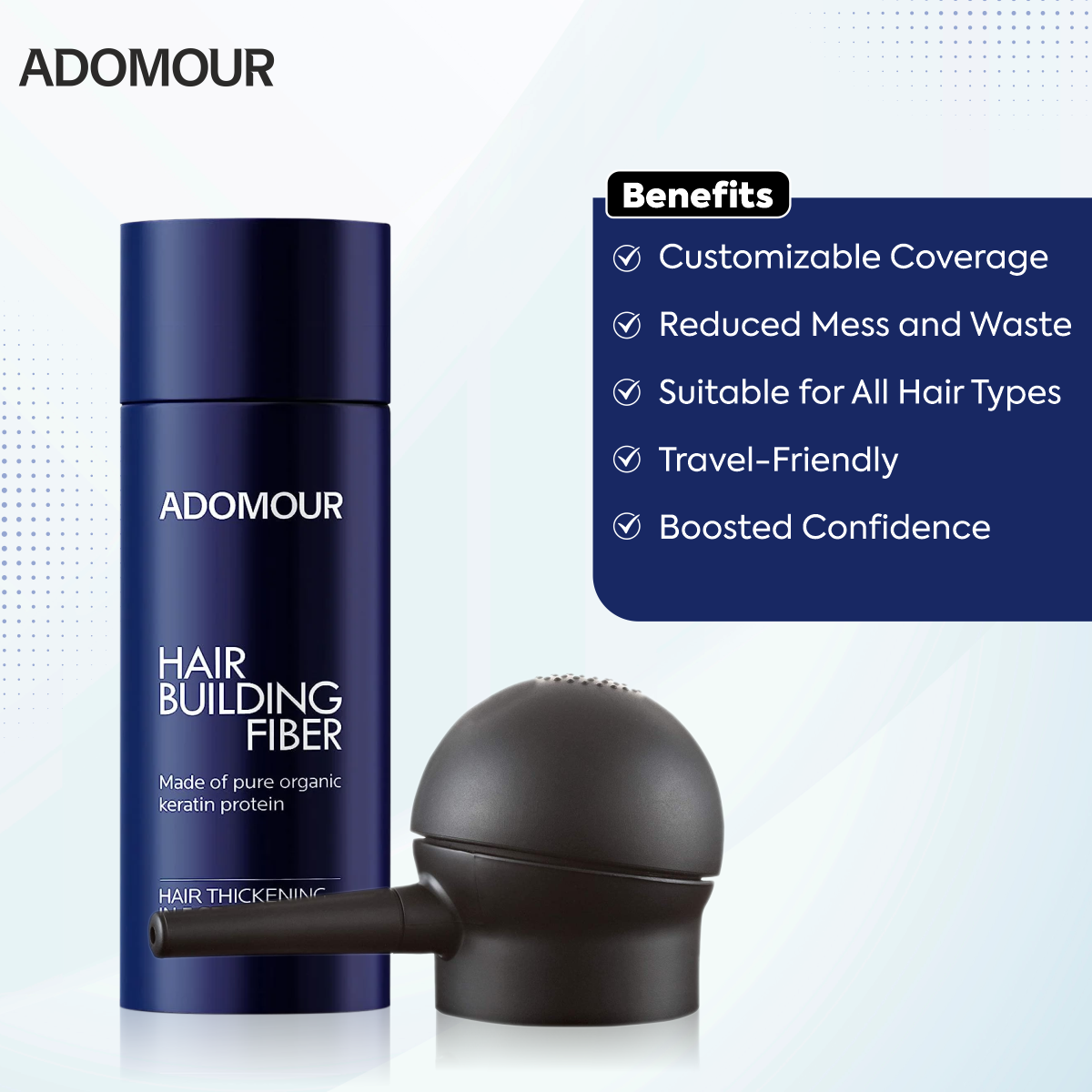 Adomour Hair Fibers are lightweight, natural fibers made of Keratin protein, the same protein found in hair strands, that can be applied to your hair giving it a thicker and fuller appearance, hiding thinning spots instantly and effectively.